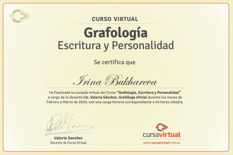 Хочу поблагодарить своего талантливого преподавателя – Ирину Бухареву за те знания, которые были вложены в основу моего развития в таком направлении как графология. Очень интересный и увлекательный курс, пролетает на одном дыхании.